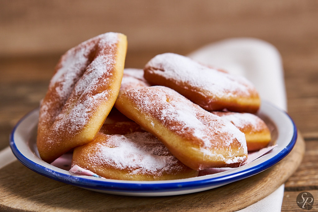 - Odcedi na papirnati brisači in potresi s sladkorjem v prahu.